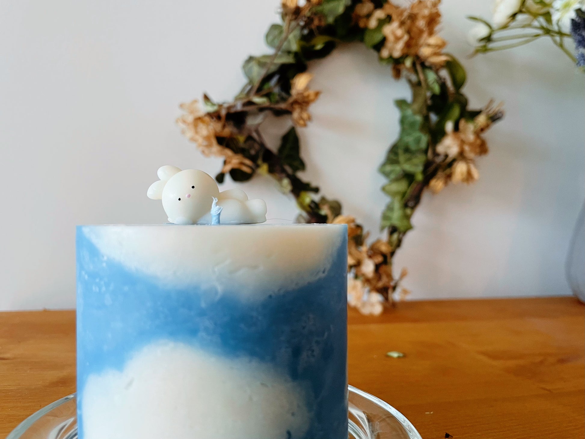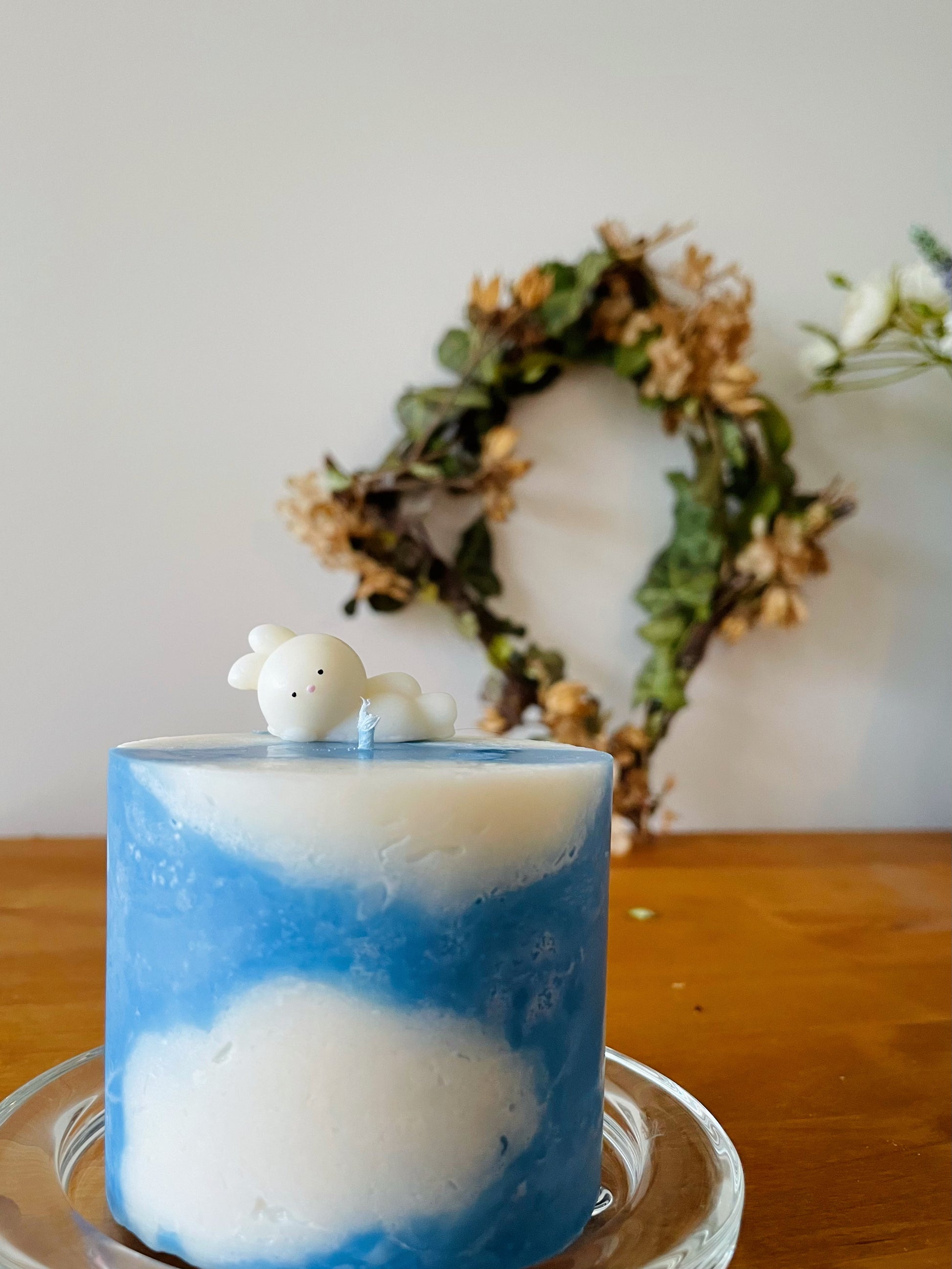- Kürzen Sie den Docht auf 5 mm und stellen Sie die Kerze auf eine hitzebeständige Unterlage mit erhöhten Rändern, um Wachstropfen aufzufangen.